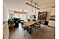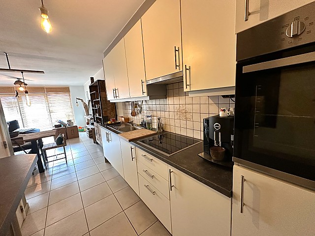 Ruime, lichtrijke living met open keuken voorzien van spoelbak, koelkast, oven en keramische kookplaat