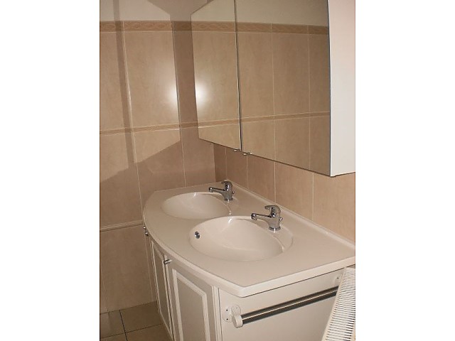 Badkamer met ligbad, toilet en dubbele wastafel in meubel