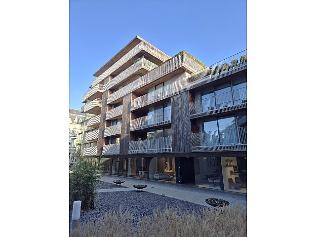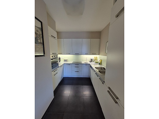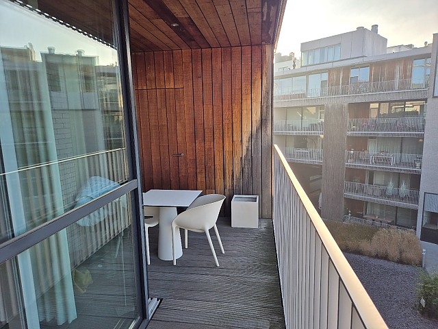 Bij binnenkomst treft u een inkomhal met praktische ingebouwde kast. De keuken is volledig uitgerust met dubbele spoelbak, keramische kookplaat, oven en vaatwasser. De ruime en lichtrijke living geeft direct toegang tot een mooi terras met uitzicht op de sfeervolle binnenkoer van de residentie.