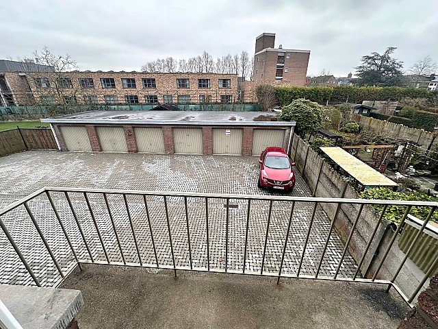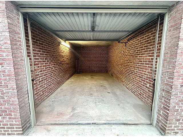 Achter het gebouw bevindt zich een ruime garage, bij aan te kopen aan €25.000,00. Deze is vlot bereikbaar, beschikt over elektriciteit en biedt bovendien een extra autostaanplaats voor de garage. De garages werden doorheen de jaren vernieuwd.