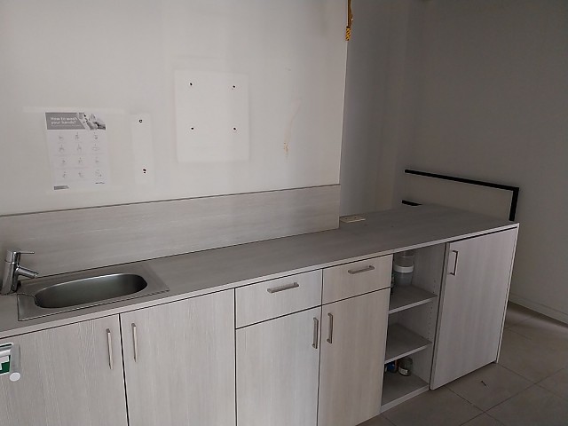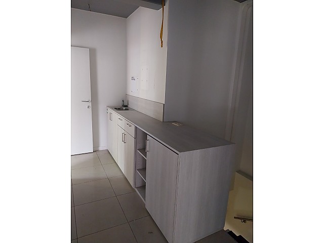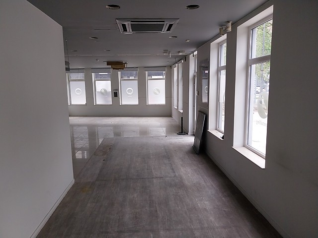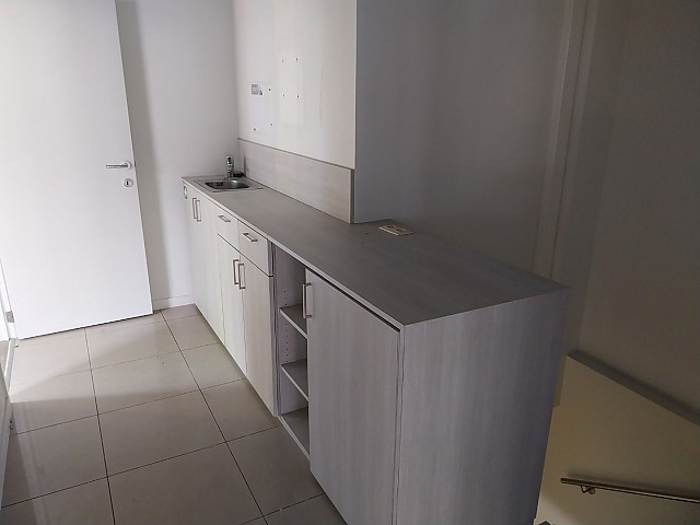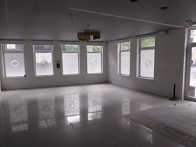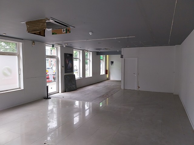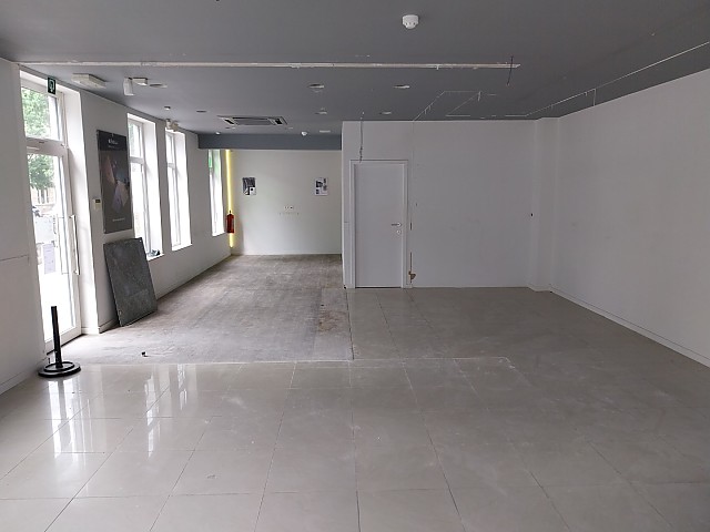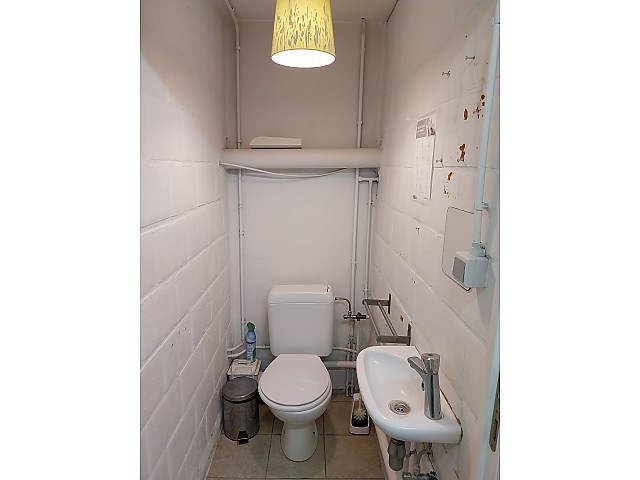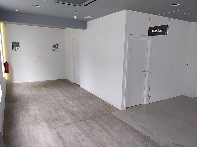 Handelspand te huur in Hasselt, bestaande uit een grote handelsruimte, toilet en een apart keukentje.