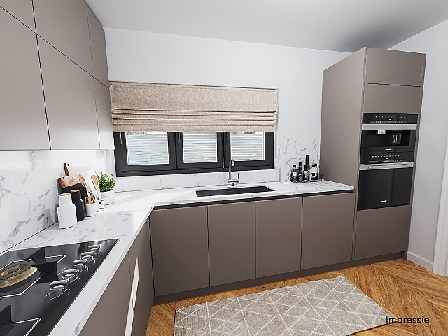 Bij binnenkomst leidt de inkomhal u naar de ruime en aangename leefruimte met parketvloer, die dankzij de grote ramen geniet van veel natuurlijk licht. Hier heeft u directe toegang tot het eerste terras aan de voorzijde van het gebouw. De keuken is volledig uitgerust met een keramische kookplaat, oven, dampkap, koelkast en een dubbele inox spoelbak. Daarnaast is er een handige keukenberging.