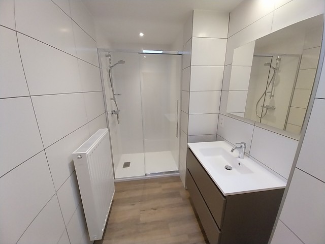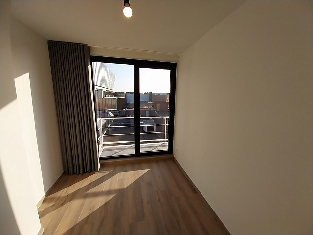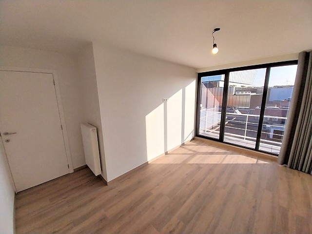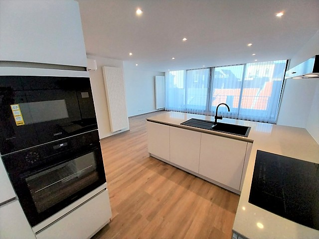 Het appartement beschikt over een ruime en lichtrijke leefruimte met een open, volledig uitgeruste keuken voorzien van kasten, enkele spoelbak, inductiekookplaten, oven, microgolfoven, dampkap, koelkast en vaatwasser.