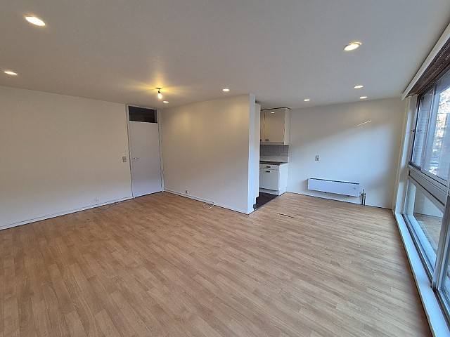 Het appartement bestaat uit een inkomhal, een apart toilet, een lichtrijke woonkamer met open keuken (voorzien van kasten en een dubbele inox spoelbak), één slaapkamer en een badkamer met ligbad, lavabo en bidet.