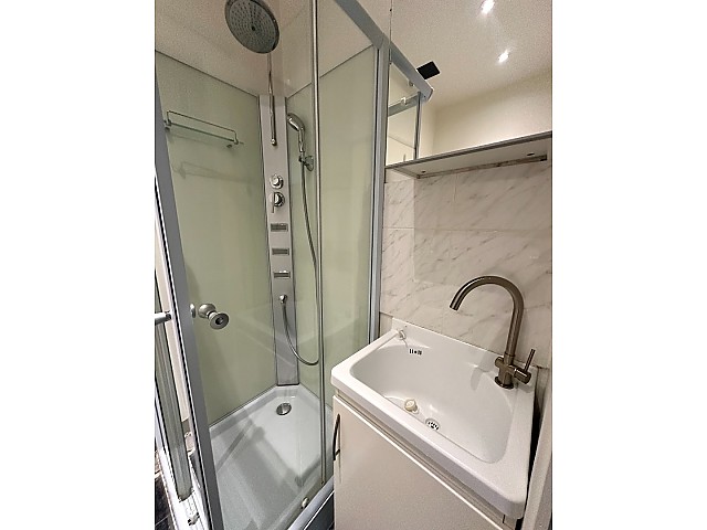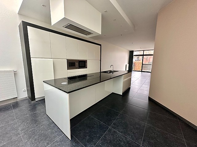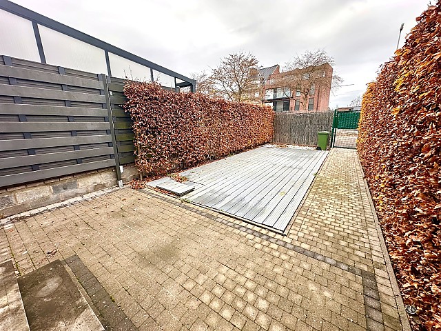Op het gelijkvloers vinden we een ruime leefruimte met open keuken (koelkast, diepvries, keramische kookplaat, vaatwasser, dubbele spoelbak), 1 slaapkamer, douchekamer (met aansluiting voor wasmachine), apart toilet, gezellige stadstuin met achteringang + afgesloten gedeelde fietsenberging.