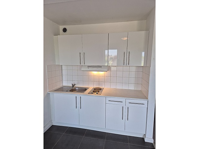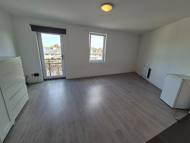 Deze studio bestaat uit een inkomhal, een leef- en slaapruimte met open keuken, uitgerust met kasten, een inox spoelbak, elektrisch fornuis, dampkap en koelkast.